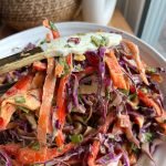 prepare the salad: in a large bowl, combine purple cabbage, diced bell peppers, thinly sliced carrots, chopped green onions, and cilantro.