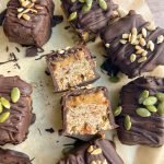 prepare the base layer: -in a food processor, combine pitted medjool dates, sunflower seeds, pumpkin seeds, flax meal, vanilla protein powder, vanilla extract, dairy-free yogurt, and sunflower seed butter. -blend until the mixture forms a dough-like consistency. if the dough is too wet, you can add a little oat flour until desired consistency is reached. -press the mixture evenly into a parchment-lined small bread loaf pan or a small baking pan. ensure it forms a smooth and compact layer.