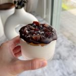 base: 1 cup low fat cottage cheese 1 tbsp nancy’s cream cheese 1/4 cup low fat greek yogurt 1 tsp vanilla bean paste 1 tbsp maple syrup add a splash of milk of choice if needed topping: 1 tbsp runny almond butter coating: 2 tbsp vegan chocolate chips 1/2 tsp coconut oil