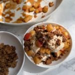 make the baked crumble -preheat oven to 350°F (175°C). in a small bowl, mix almond flour, coconut sugar, melted coconut oil or butter, cinnamon, and salt until combined and clumpy. -spread onto a parchment-lined baking sheet and bake for 6–8 minutes, stirring halfway, until golden brown and fragrant. let cool — it will crisp up as it cools.