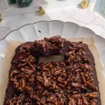 1 cup gluten-free 1:1 flour (like bob’s red mill) ¾ cup raw cane sugar (or coconut sugar) ½ cup unsweetened cocoa powder ½ teaspoon baking powder ¼ teaspoon sea salt ½ cup melted vegan butter (or regular butter if preferred) 2 large eggs, room temperature ⅓ cup kefir (dairy or dairy-free) ½ tablespoon vanilla extract ½ cup vegan chocolate chips or chunks for the sticky pecan topping 1 cup chopped pecans ¼ cup maple syrup 2 tablespoons vegan butter 2 tablespoons coconut sugar 1 teaspoon vanilla extract pinch of sea salt