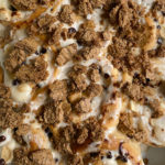whisk the glaze ingredients together, pour on the top while the rolls are warm. in another bowl, mix the graham cracker crumbles dough and add to a parchment lined baking tray. you can slightly wet your hands to evenly distribute it into a rectangle about 1/3 inch thick since the dough is sticky.