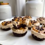 in a mixing bowl, add the cream cheese, peanut butter, greek yogurt, honey or maple syrup, and vanilla. mix until completely smooth and creamy. spoon the cheesecake filling evenly over the brownie bases and smooth out the tops. freeze for 30 minutes to set.