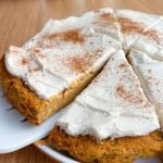 ingredients: 1 and 1/2 cans (15-ounce cans) organic pumpkin purée 1/3 cup maple syrup + 2 tbsp 1/3 cup arrowroot powder 2 tsp pumpkin pie spice 2 tbsp almond butter 14 ounces extra-firm tofu 2 tsp vanilla extract vegan cream cheese or whipped cream (for topping)