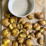 place on a parchment lined baking tray and use the bottom of a glass or mug to flatten the potatoes.