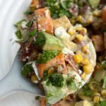in a large salad bowl, add the cubed baked sweet potatoes, crumbled vegan bacon, baked tofu cubes, fire-roasted corn, diced avocado, and crumbled vegan feta cheese.