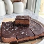 make the ganache topping: add chopped chocolate to a heat-safe bowl. warm the coconut milk in a small saucepan over medium-low heat until just simmering (do not boil). pour over the chocolate and let sit for 2–3 minutes. stir until completely smooth and glossy. stir in vanilla and sea salt if using. pour the ganache over the filling and spread into an even layer.