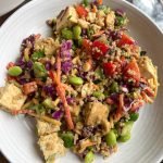 assemble the salad base: in a large bowl, combine the cooked quinoa, edamame, roasted tofu cubes, diced cucumber, diced red bell pepper, chopped red cabbage, shredded carrots, chopped cilantro, and green onion. toss to combine evenly.