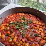 combine + bake: gently stir beans into the sauce. drizzle a little extra olive oil on top. cover with lid (or foil) and bake at 375°F (190°C) for 45 minutes. uncover and bake another 25 minutes until bubbling and caramelized at the edges.