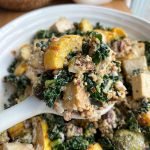 salad: 1 bunch lacinato kale, massaged in avocado oil 14 ounces extra firm tofu, baked 2 small delicata squashes, cut into small pieces 1 bag of brussels sprouts, cut in half and coated with avocado oil, baked at 400 degrees for 25-28 minutes 3/4 cup toasted pecan halves 1 and 1/2 cups cooked quinoa 8 ounces crumbled vegan feta dressing: 1/4 cup fresh orange juice 1/3 cup runny tahini 2 minced garlic cloves 1 tbsp ginger juice or grated ginger 1 tbsp liquid aminos 1 and 1/2 tbsp maple syrup vegetable broth (if necessary to thin out)