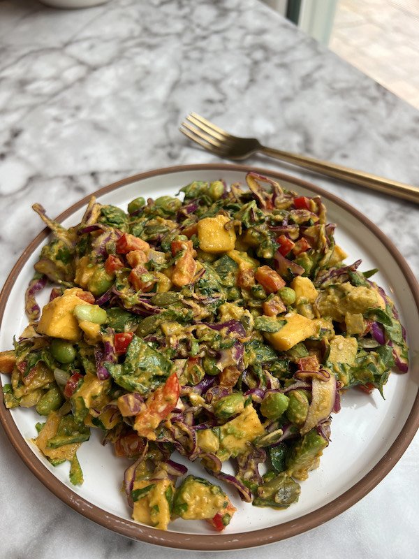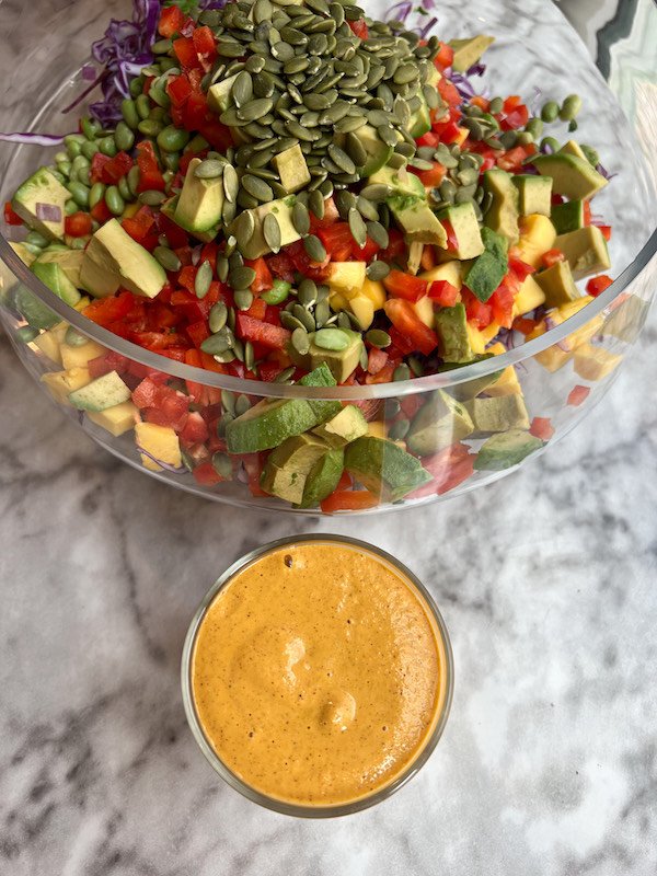 - in a large salad bowl, combine the edamame, purple cabbage, red bell pepper, mango, avocado, chopped spinach, red onion, and pumpkin seeds.