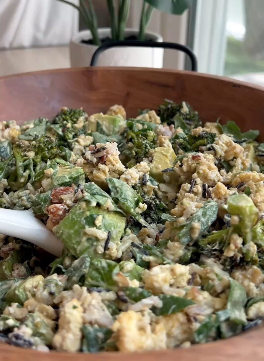 - once the tofu, broccoli, and wild rice have cooled, add them to a large salad bowl. add 2 cups of chopped spinach, 1 large diced avocado, and 1/2 cup of chopped almonds to the bowl.