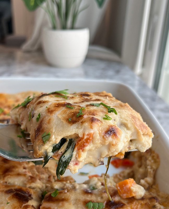 the vegan egg mixture, made from firm tofu, gives the dish a creamy, custard-like texture that holds everything together.