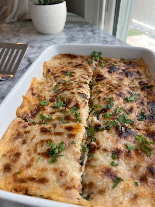 top with more vegan shredded mozzarella and bake at 375°f for 25 minutes until the top is golden and set.