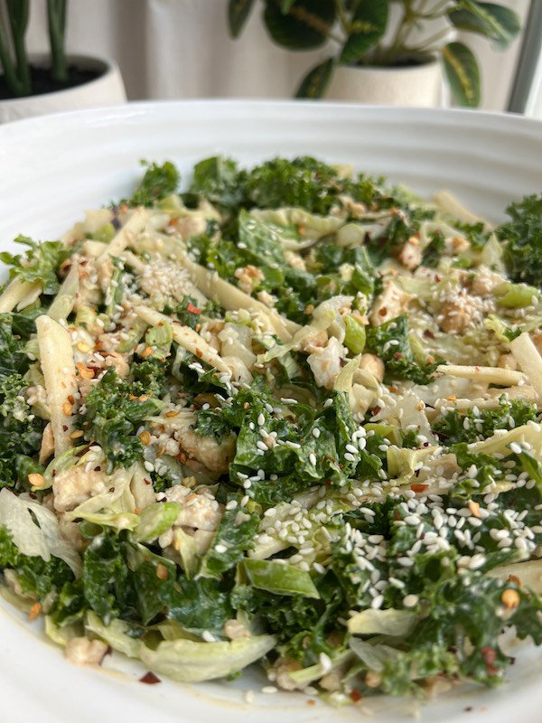 - prep greens: massage 3 cups shredded kale with 1 tsp avocado oil until tender. combine with 2 cups chopped romaine, 1/3 cup finely sliced green onion, 1 large shredded honeycrisp apple, and 3/4 cup roasted cashews in a large bowl.