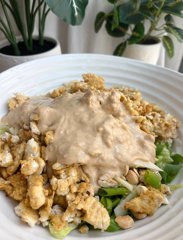 the dressing, with its combination of sesame oil, peanut butter, and maple syrup, offers healthy fats, vitamins, and minerals.