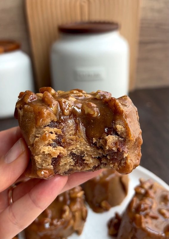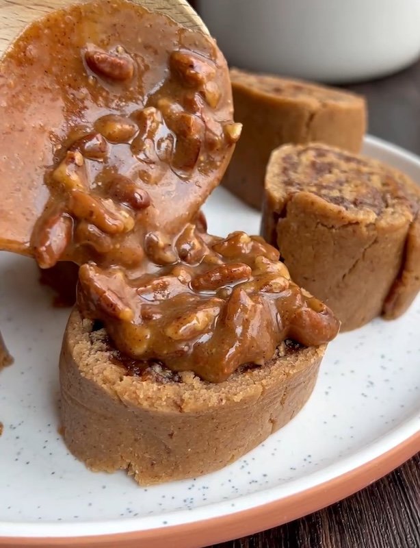 - make the sticky pecan topping – gently heat almond butter, maple syrup, coconut oil, and vanilla until smooth. stir in chopped pecans. let it cool slightly before spreading over the rolls.