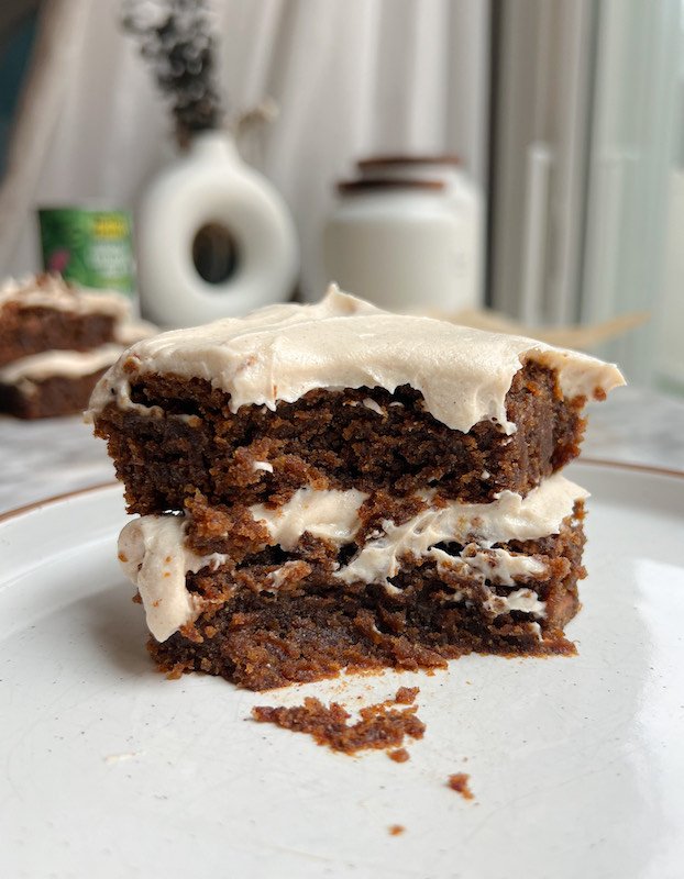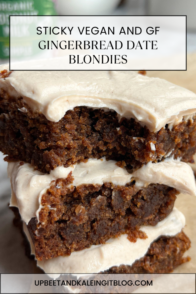 sticky vegan gingerbread date blondies with cinnamon cream cheese frosting