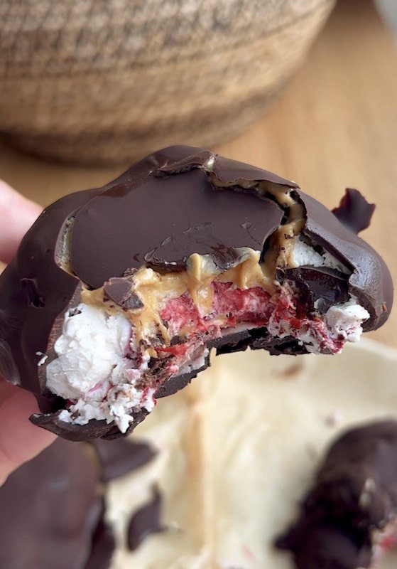 the combination of dairy-free yogurt, vanilla protein powder, and freeze-dried strawberries creates a blend of flavors that tastes like strawberry shortcake with decadent chocolate and some surprise nut or seed butter in the middle!
