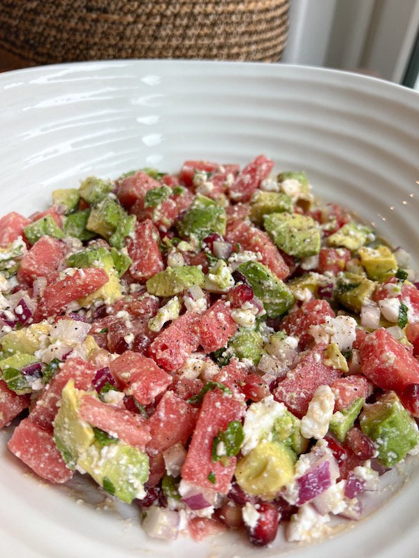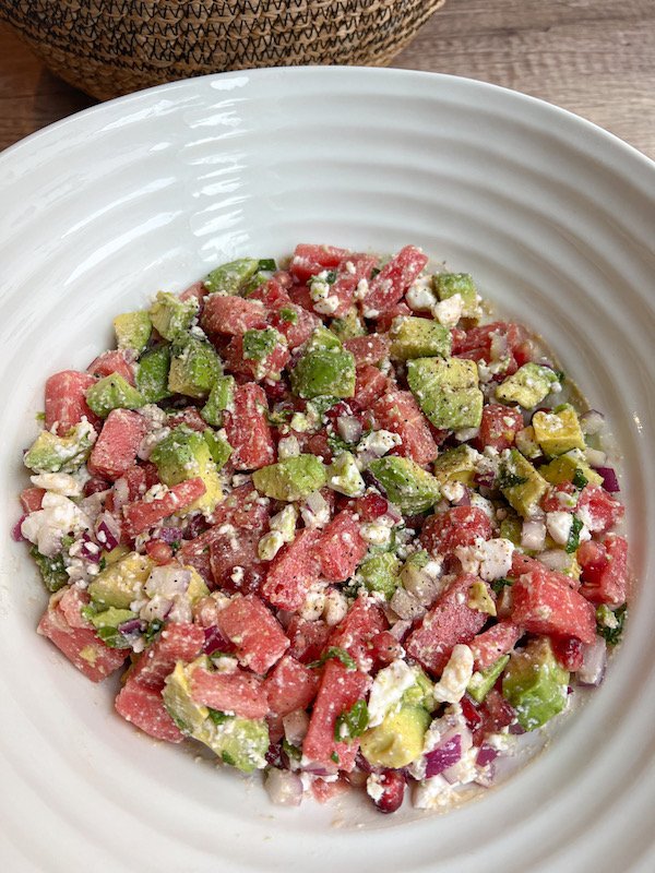 the sweet juiciness of the watermelon pairs beautifully with the creamy avocados, while the vegan feta adds a tangy, savory note.