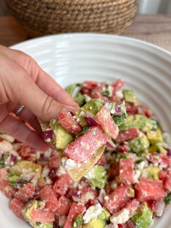 this salsa is an ideal summer dish because it’s light, refreshing, and packed with hydrating ingredients like watermelon and cucumber.