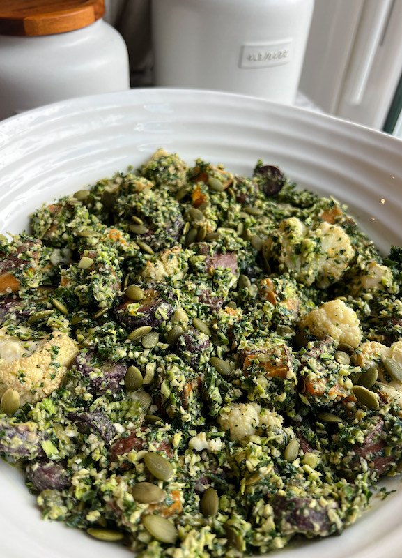preheat the oven to 400°F (200°C). spread the cauliflower, rainbow carrots, and sweet potatoes on a baking sheet. drizzle with avocado oil and sprinkle with sea salt. roast for 25–30 minutes, flipping halfway, until golden and tender. - make the dressing