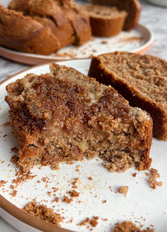 while this banana bread is delicious on its own, take it to the next level by brushing a slice with avocado oil, sprinkling it with cinnamon, and topping it with a pinch of coconut sugar.