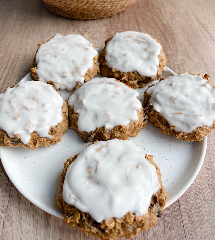 - enjoy your vegan and gluten-free oatmeal raisin breakfast cookies with icing as a delicious and nutritious morning treat!