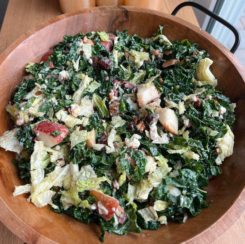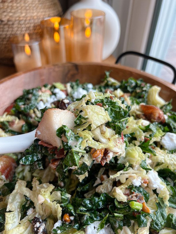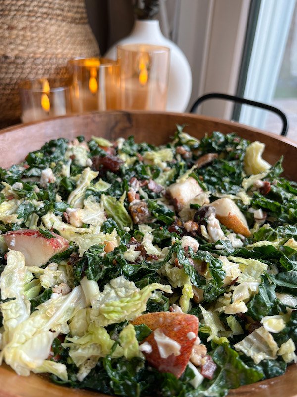 featuring thinly sliced green cabbage and lacinato kale as the crisp base, this salad embraces the sweetness of pears, the savory notes of vegan bacon, and the rich creaminess of crumbled vegan feta.