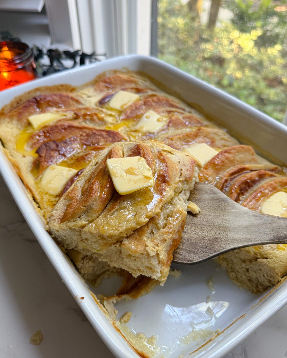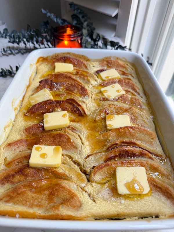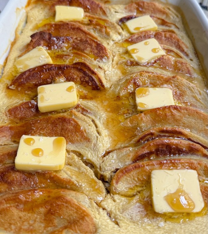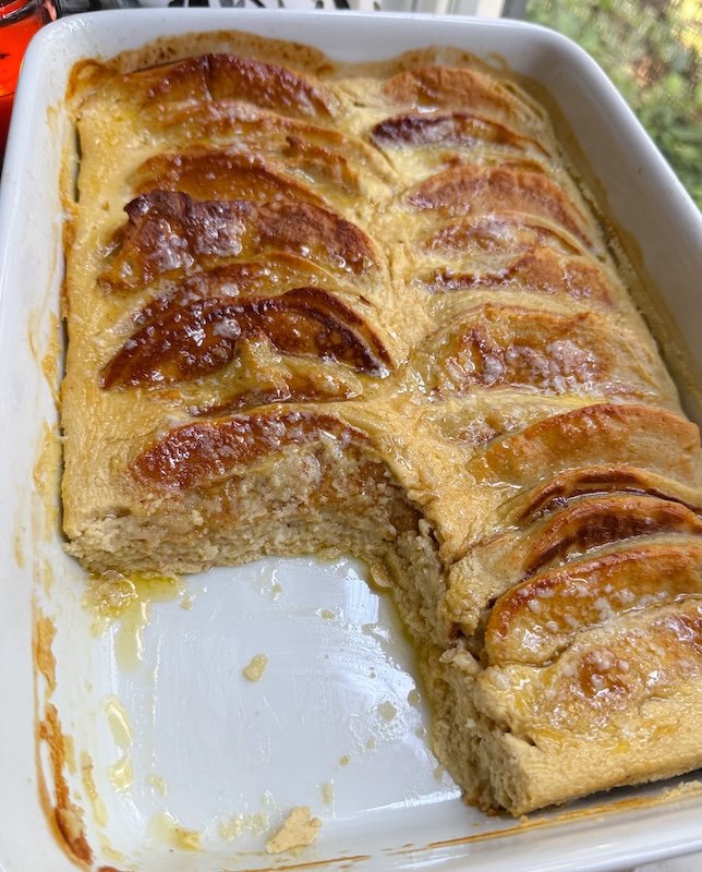 this casserole tastes like warm vanilla pancakes soaked in a silky, very lightly sweet custard.