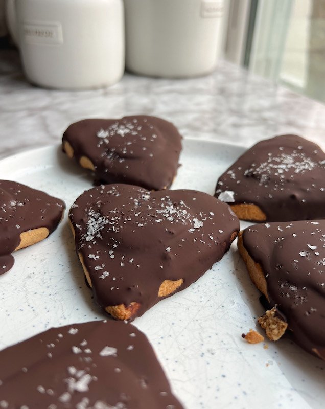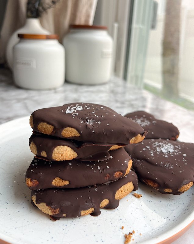 finally, the cookies are dipped in a silky chocolate coating made with chocolate chips and coconut oil.