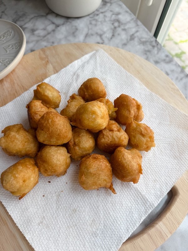 - use a small cookie scoop or two spoons to drop the batter into the oil. smaller balls cook more evenly.