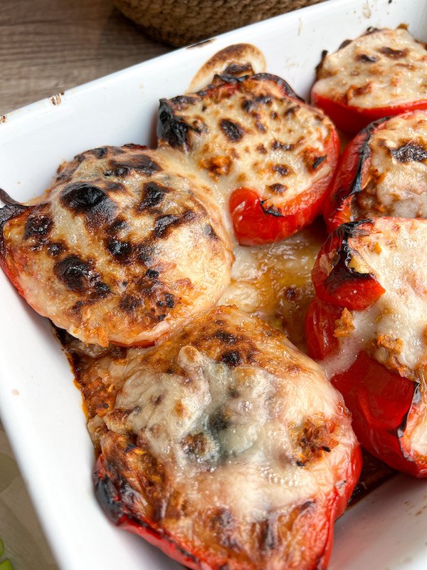 these peppers are loaded with flavor, thanks to marinara sauce, garlic powder, and a generous sprinkle of vegan mozzarella.